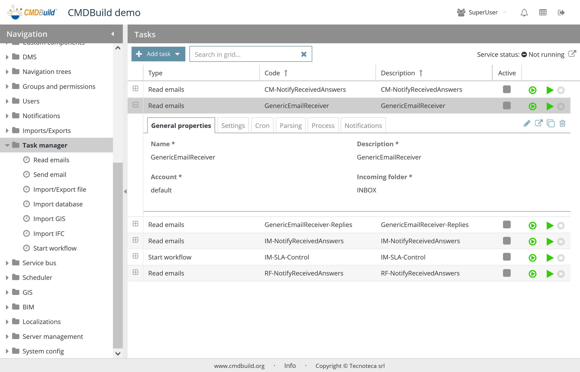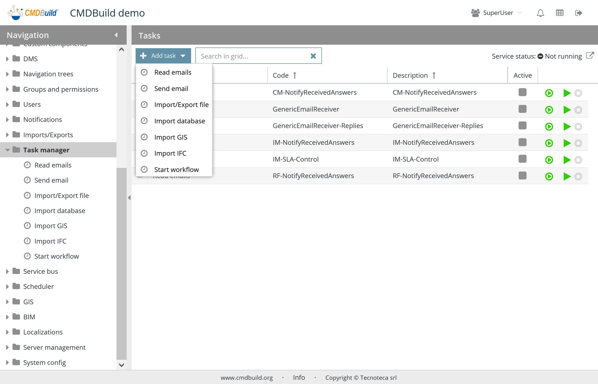 CMDBuild allows you to configure automatic operations executed in background by a Task Manager integrated in the system.