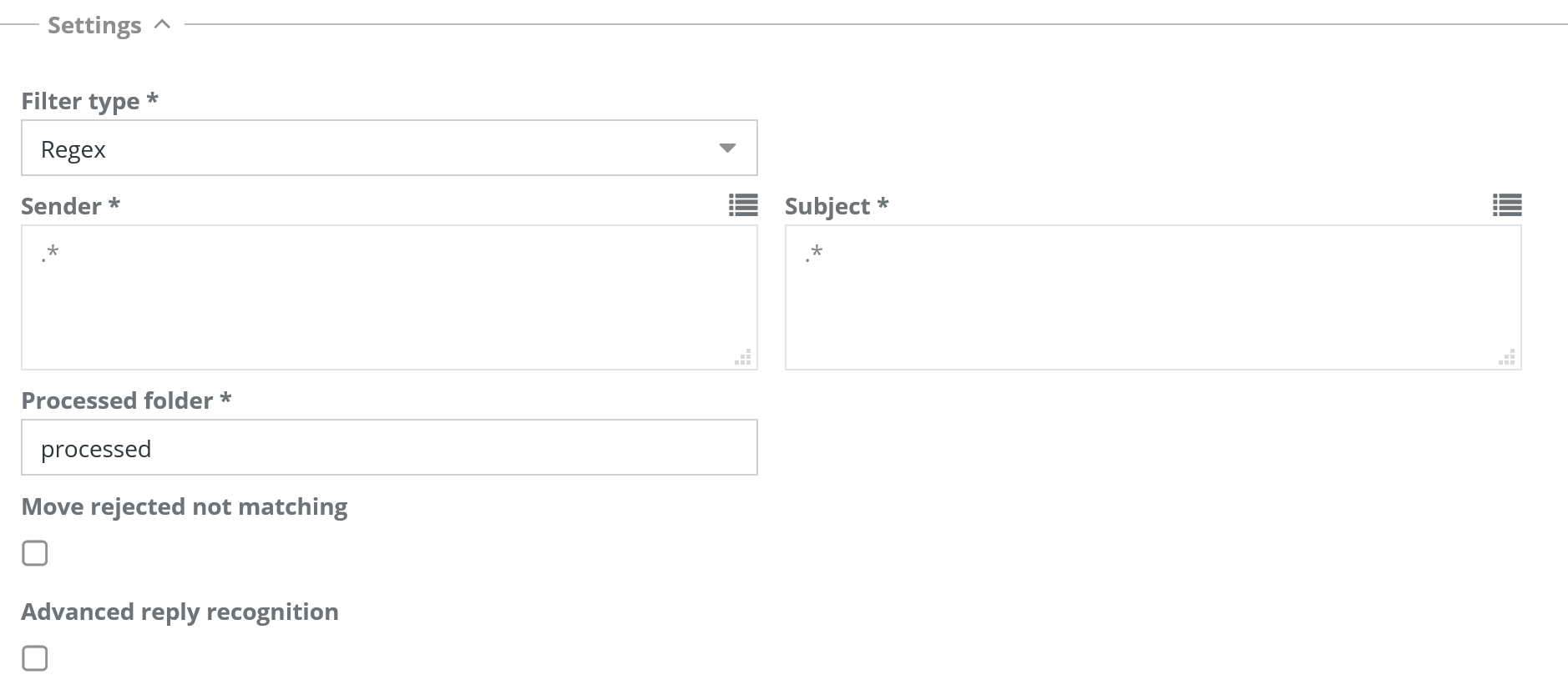 Filter on the subject: It includes any Regex filter set on the subject of the e-mail in order to exclude less interested e-mail; it is expressed as regular expression and can be set through a proper pop-up window