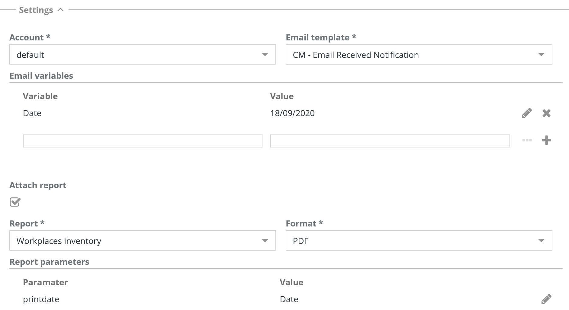 - Attach report: requests to attach the report, actions and possible errors to the mail