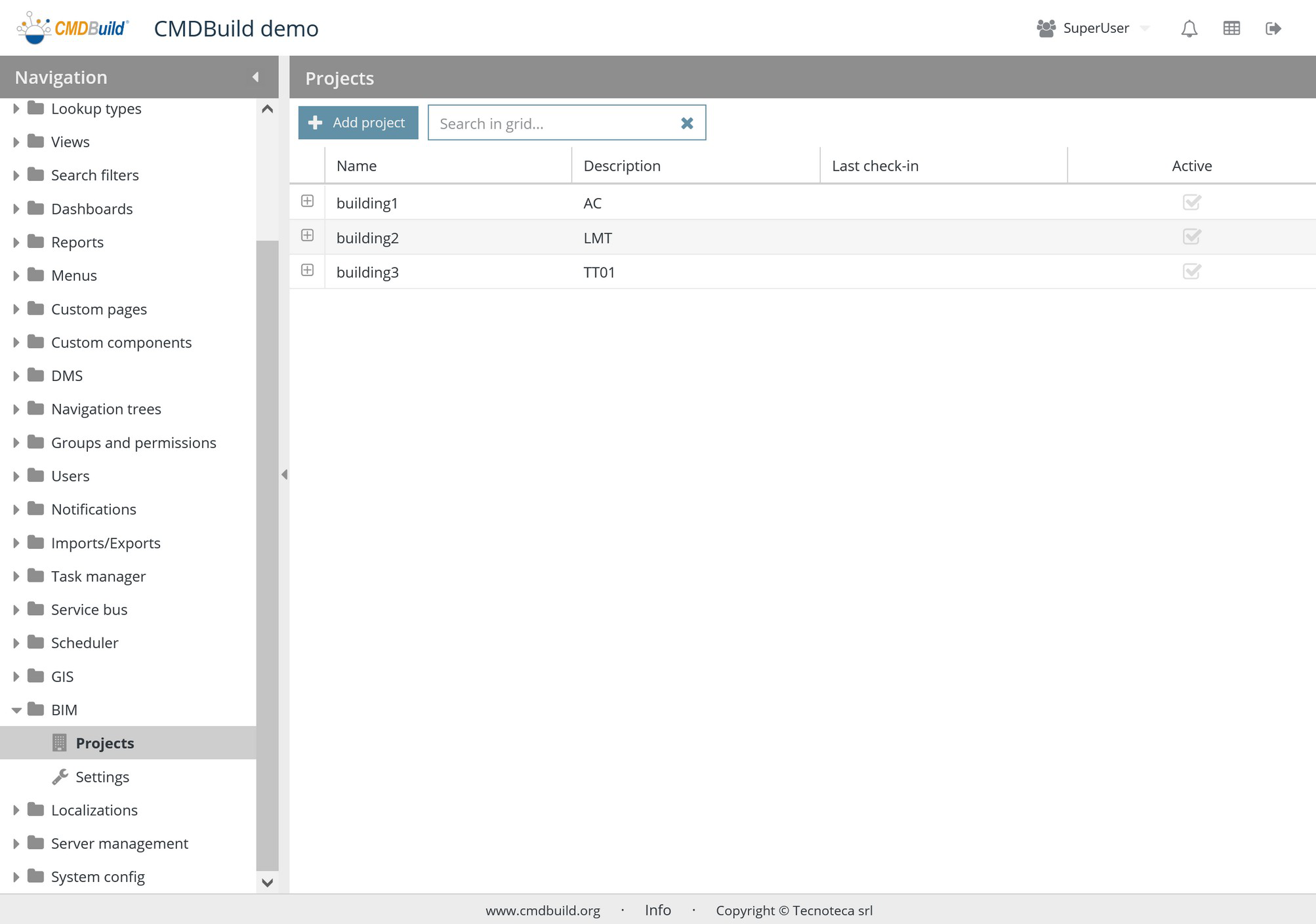 This function allows to manage BIM projects managed in CMDBuild. Every project is usually associated to a building or to a built up area.