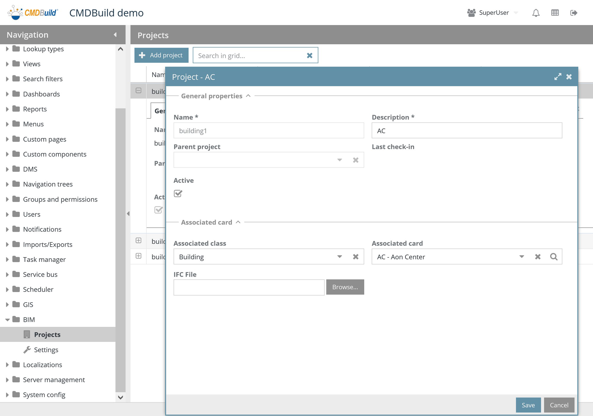CMDBuild supports the BIM paradigm (Building Information Modeling), which is a conceptual solution with the aim of managing the building design procedure, from the conception of the building to its construction, use and maintenance, and finally to its demolition, if any.