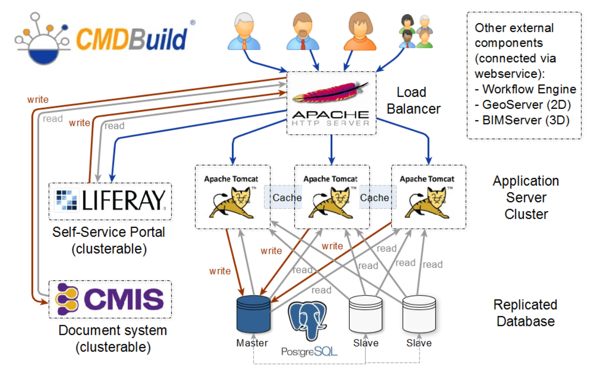 CMDBuild allows you to configure a Cluster architecture, where a webserver load balancer distributes incoming requests to multiple CMDBuild instances (nodes).