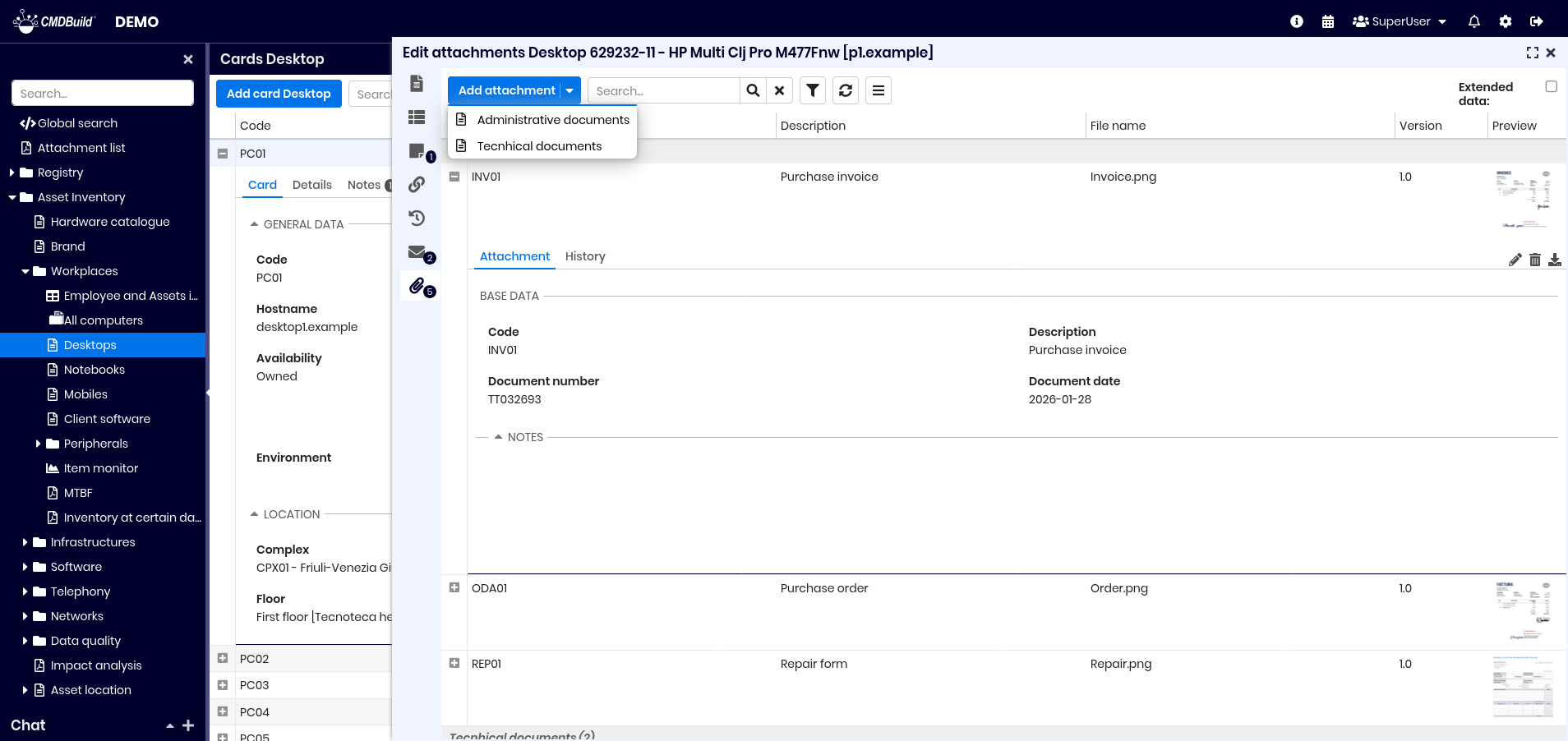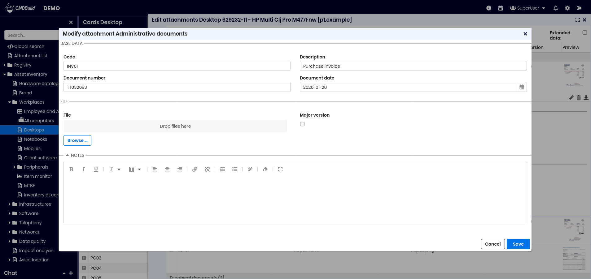 - attach files from the system or from the CMDBuild document repository