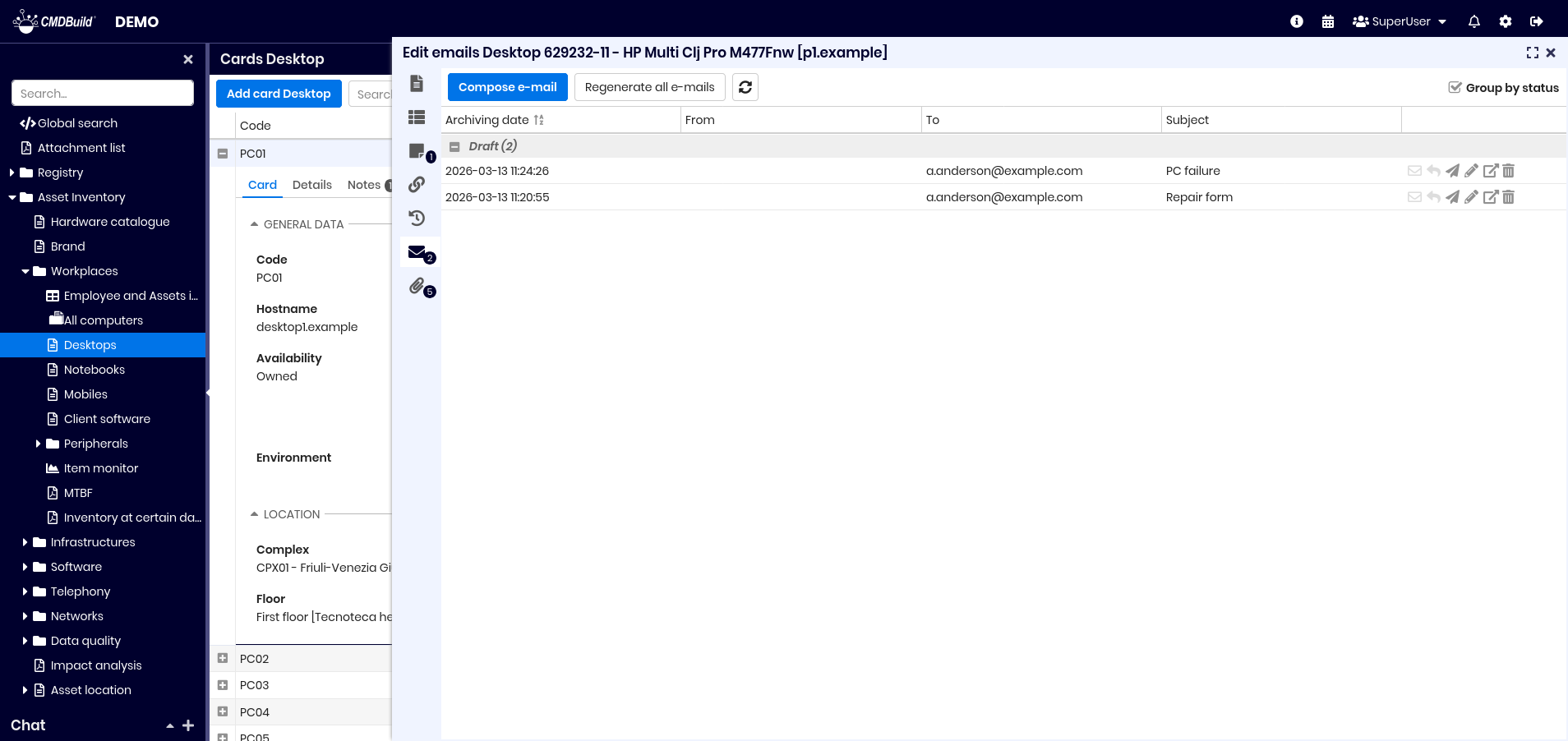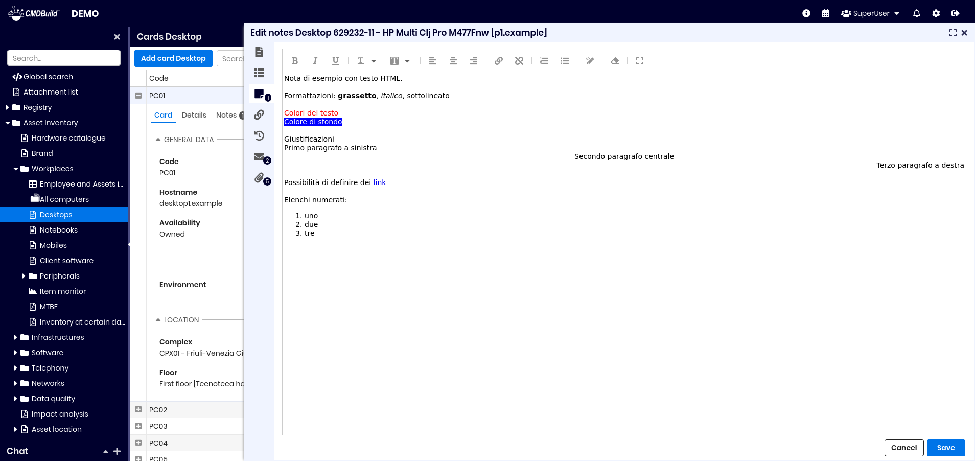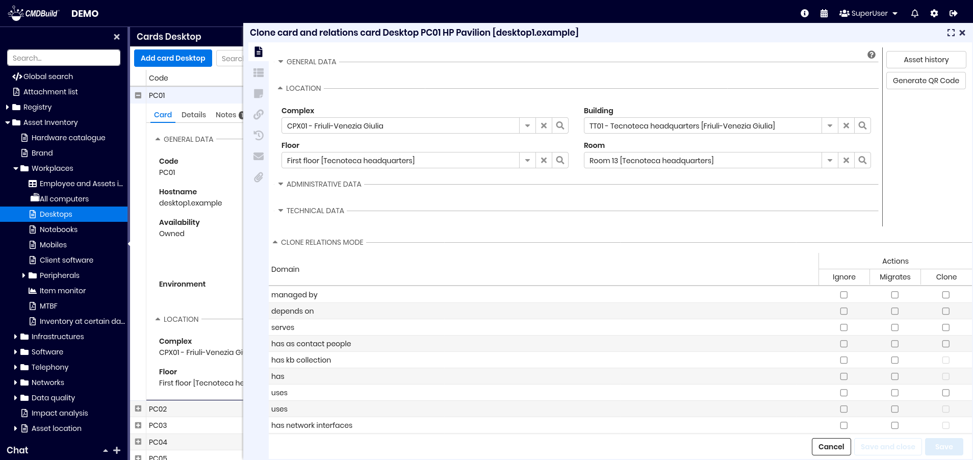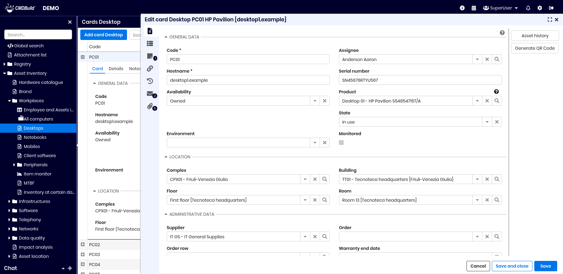 From the list of cards of a class you can access the update features of the selected card, opened in a specific popup window. The updating features available in CMDBuild allow you to insert, update and consult cards, create and view relations, check changes, send and view emails, upload and view attachments. In the grids present in the various tabs you can: