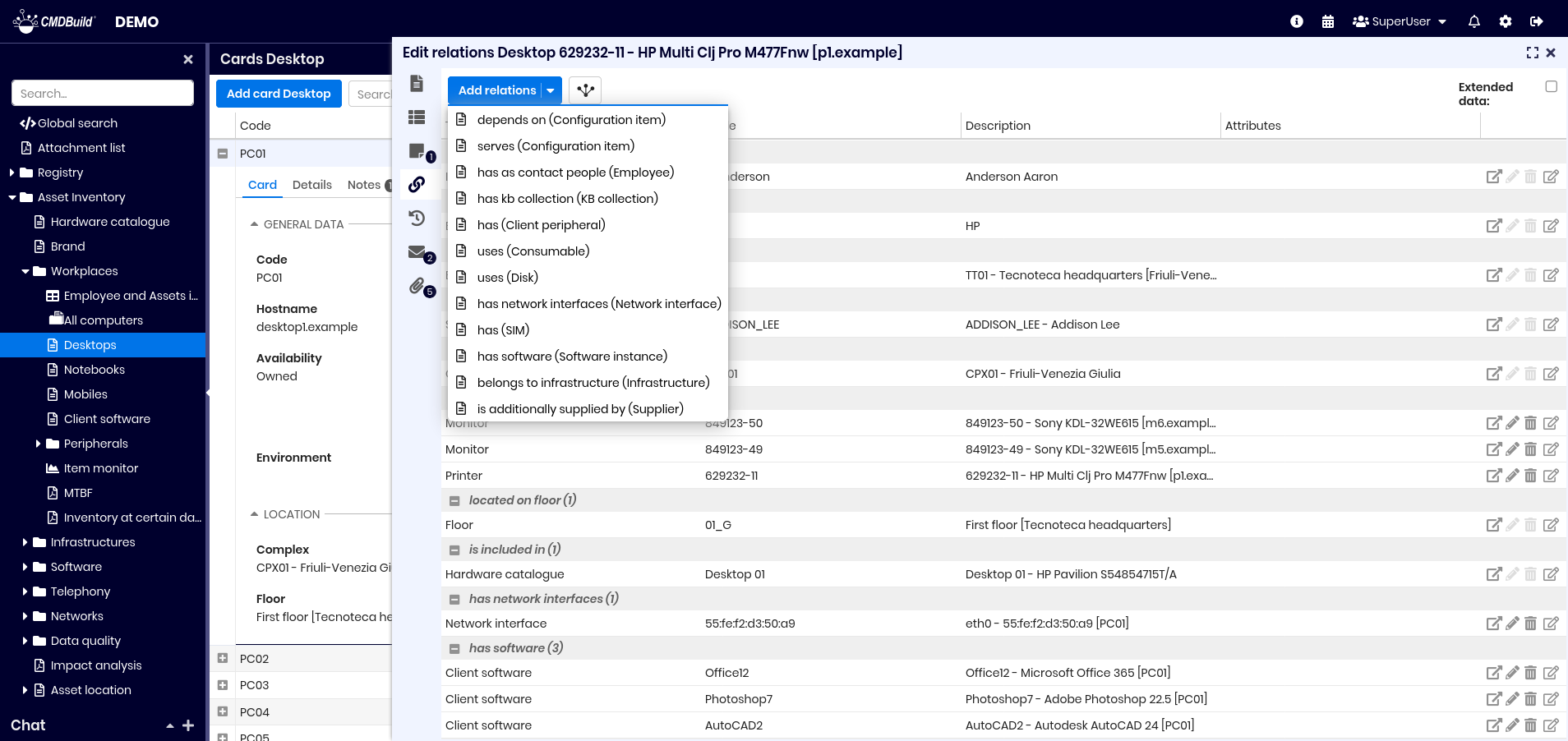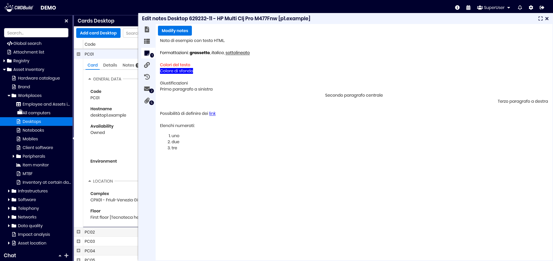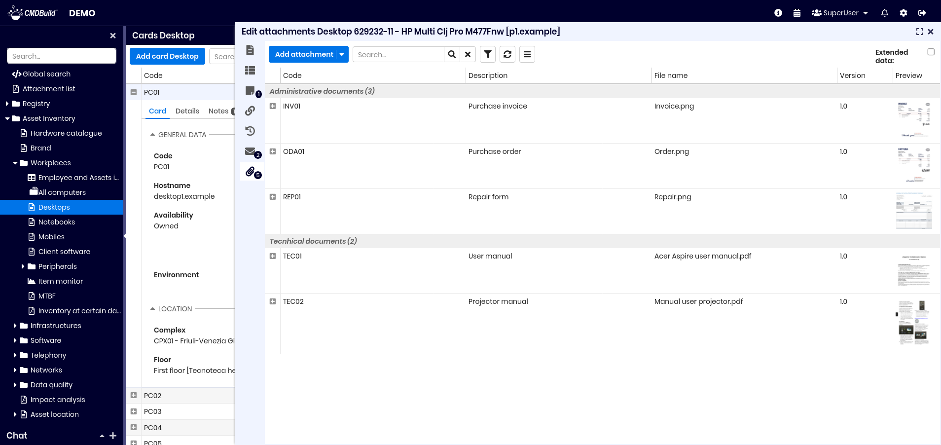 From the list of cards of a class you can access the update features of the selected card, opened in a specific popup window. The updating features available in CMDBuild allow you to insert, update and consult cards, create and view relations, check changes, send and view emails, upload and view attachments. In the grids present in the various tabs you can: