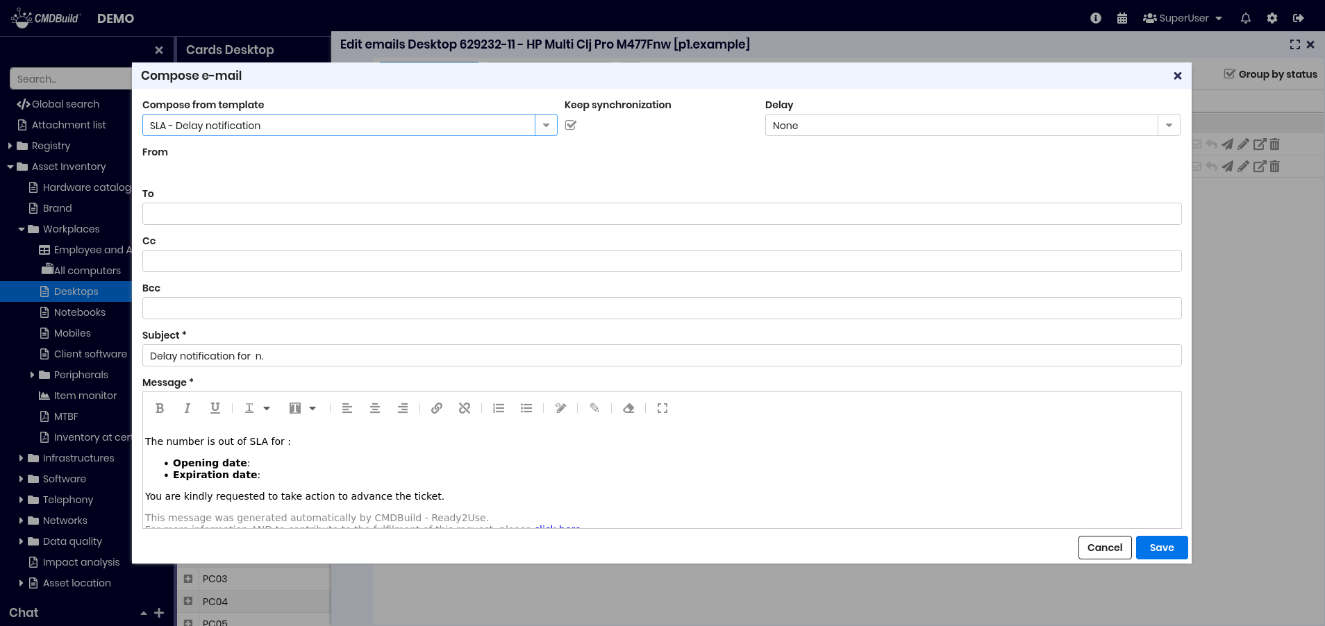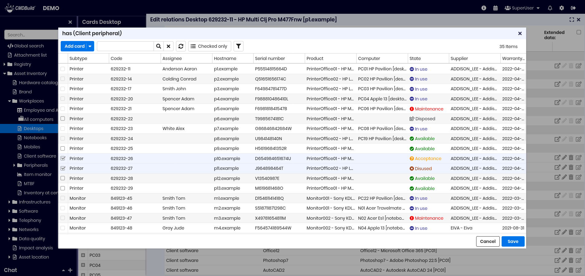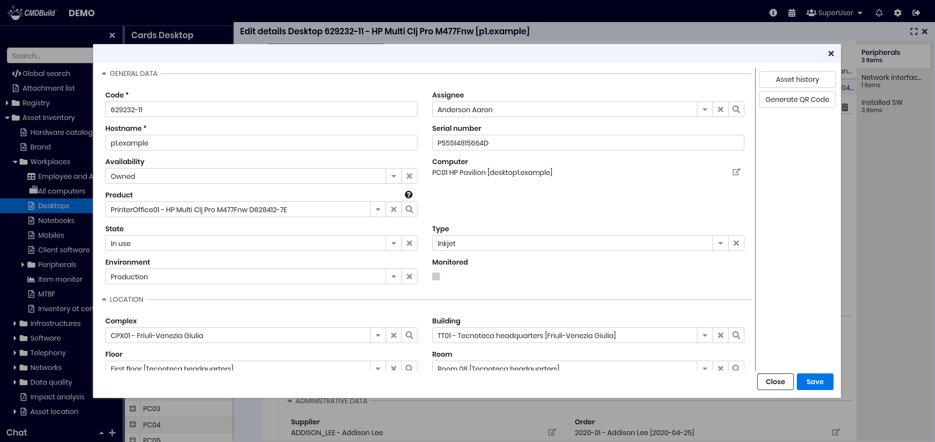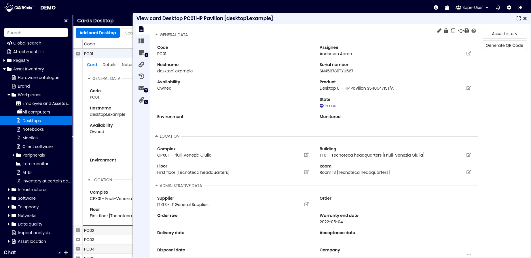 From the list of cards of a class you can access the update features of the selected card, opened in a specific popup window. The updating features available in CMDBuild allow you to insert, update and consult cards, create and view relations, check changes, send and view emails, upload and view attachments. In the grids present in the various tabs you can: