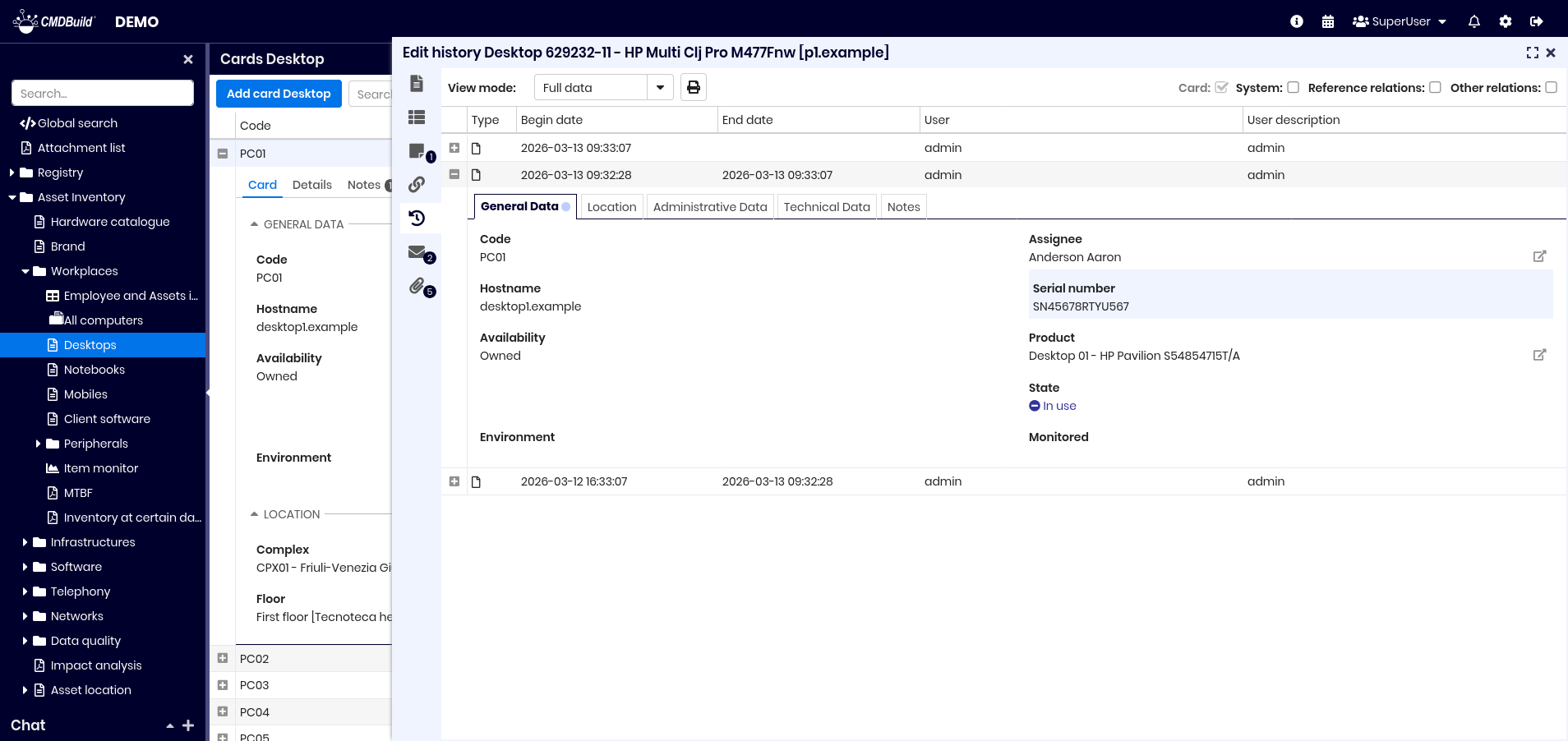 CMDBuild provides complete versioning to verify changes or reconstruct past situations.