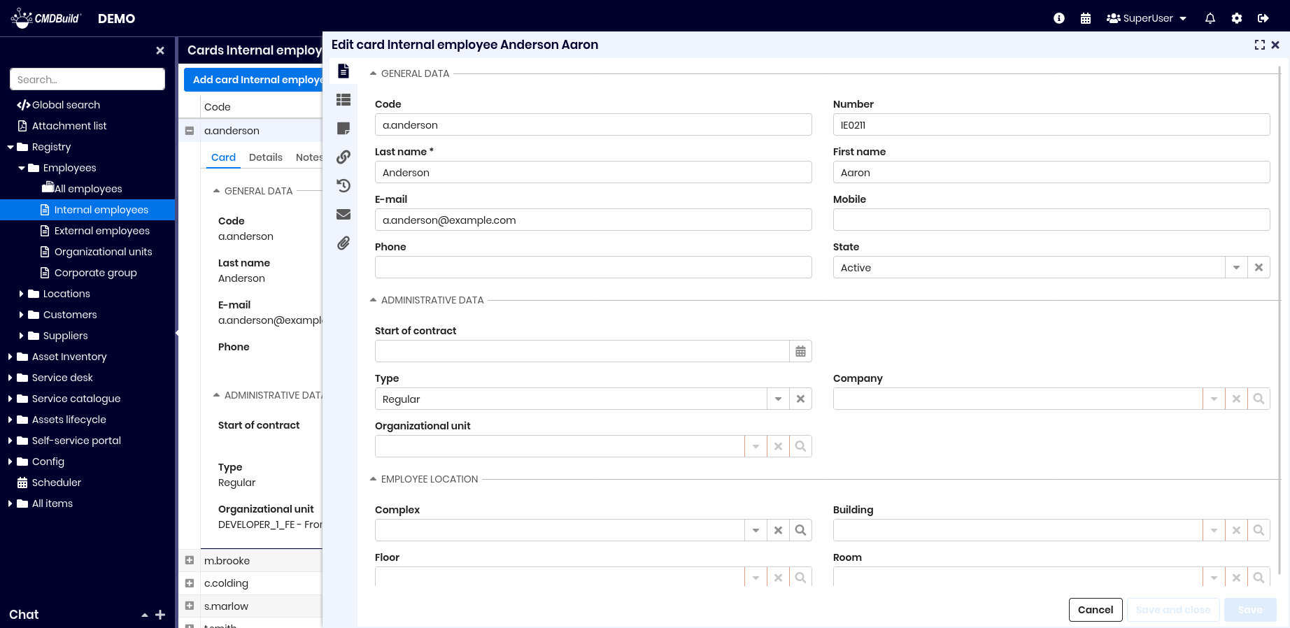 The popup window presents a card for viewing, inserting or editing information across its components: data, details, notes, relations, history, emails and attachments.